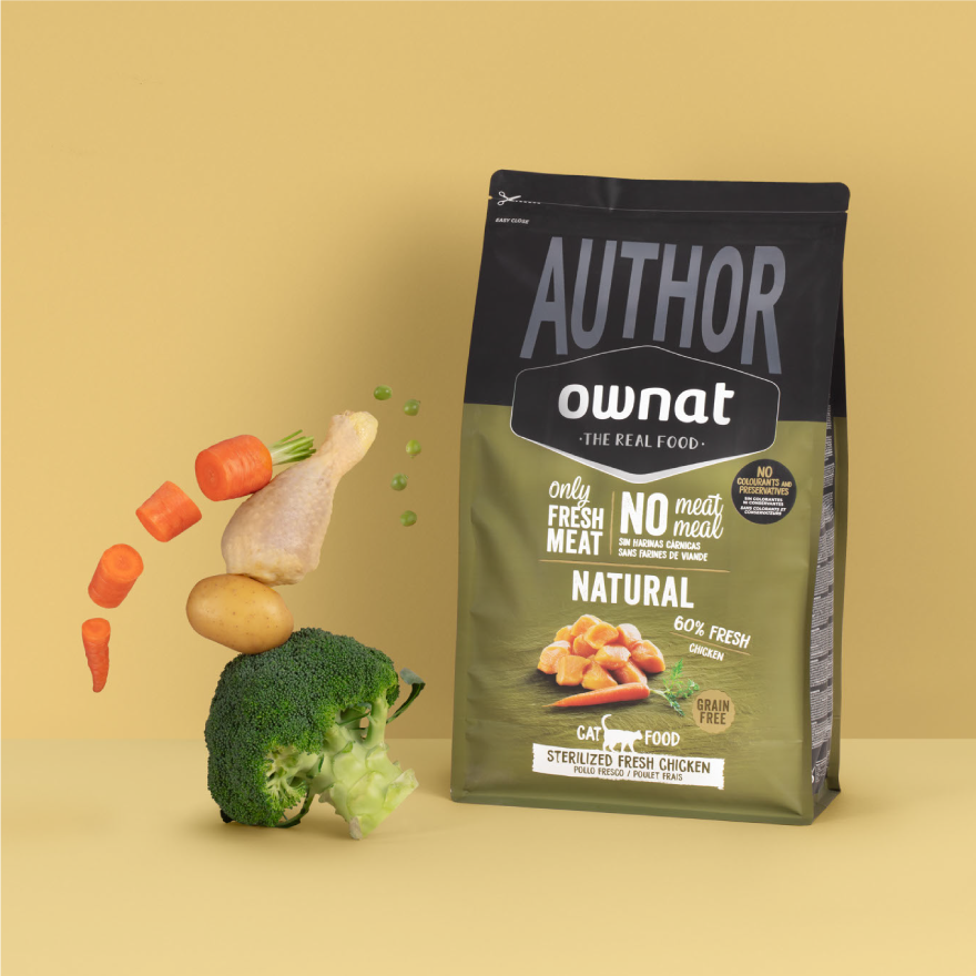A Ownat Author, com 60% de frango fresco e sem farinha de carne, é a resposta à tua preocupação com o peso e a saúde urinária do teu felino.